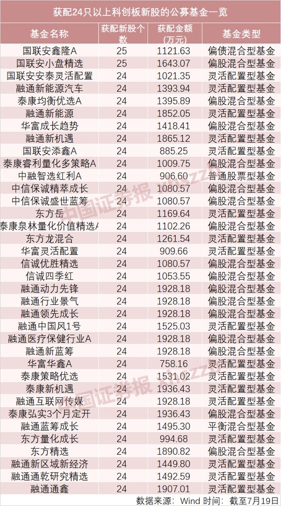 其中,国联安鑫隆A和国联安小盘精选两只基金获配了全部25只科创板新股,获配24家公司的公募基金有34只,包括东方量化成长、融通新能源、泰康均衡优选A、东方精选等基金。