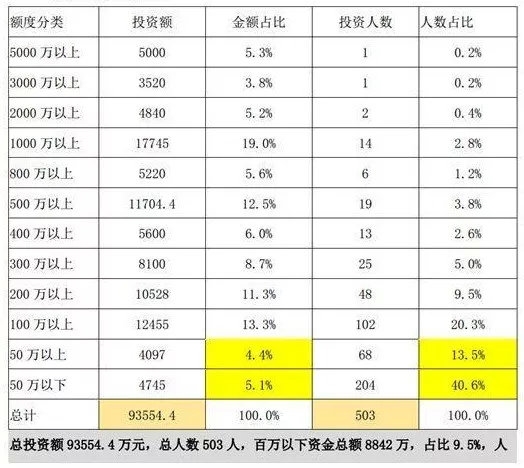 根据此前证券时报报道,根据《投委会与秦鹏见面会议纪要》显示,牵涉其中的投资人总共有503个,总投资金额高达9.4亿元。其中,投资1000万元以上的有18人,50万元以下的有204人,占投资人总数的40.6%;大部分投资人的出资金额介于50万元至1000万元之间。