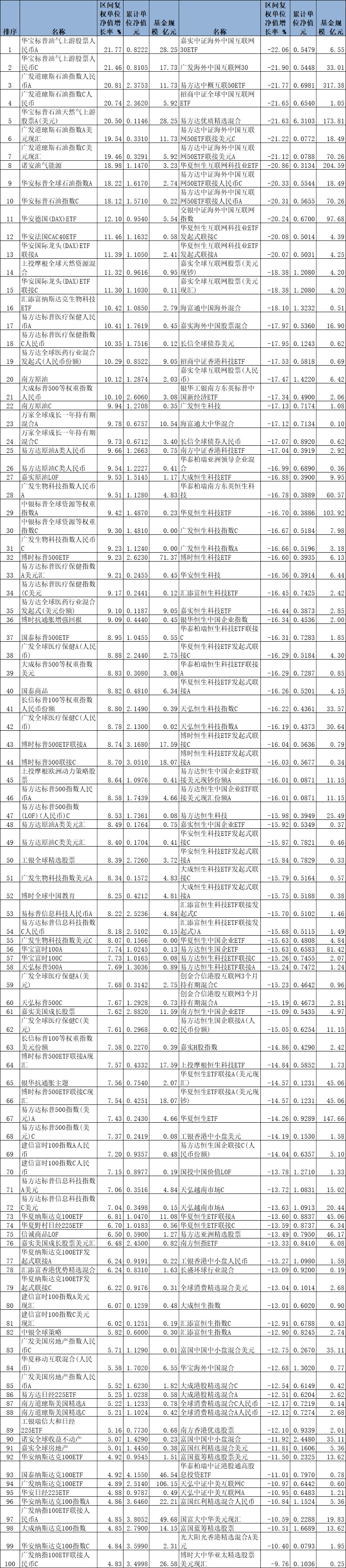 广发道琼斯石油指数A美元现汇、广发道琼斯石油指数C美元现汇、诺安油气能源、华安标普全球石油指数A、华安标普石油指数C涨幅分别为19.54%、19.46%、18.98%、18.22%、18.12%。