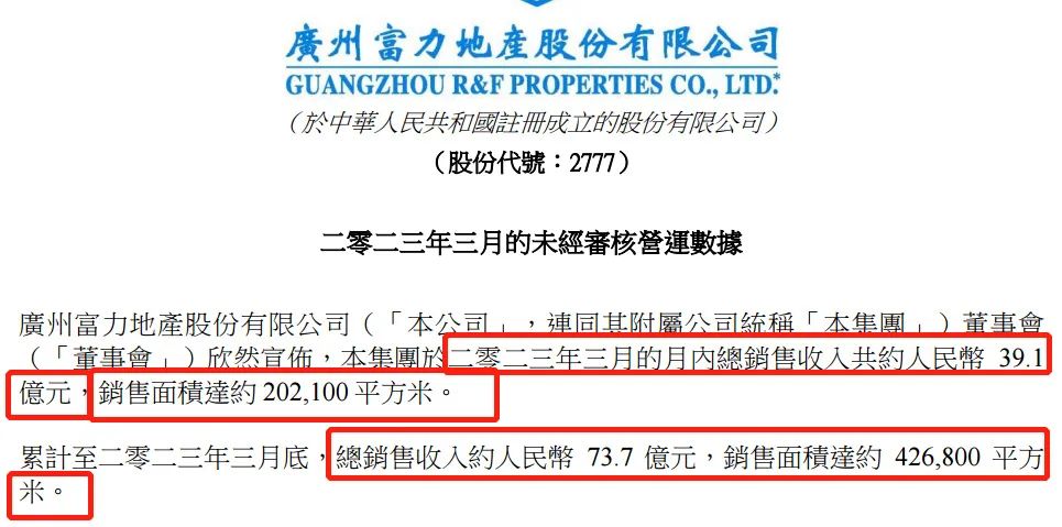 2023年4月14日,富力地产在港交所公告称,2023年3月的月内总销售收入约39.1亿元,销售面积约20.21万平方米。累计至2022年3月底,总销售收入约73.7亿元,销售面积约42.68万平方米。