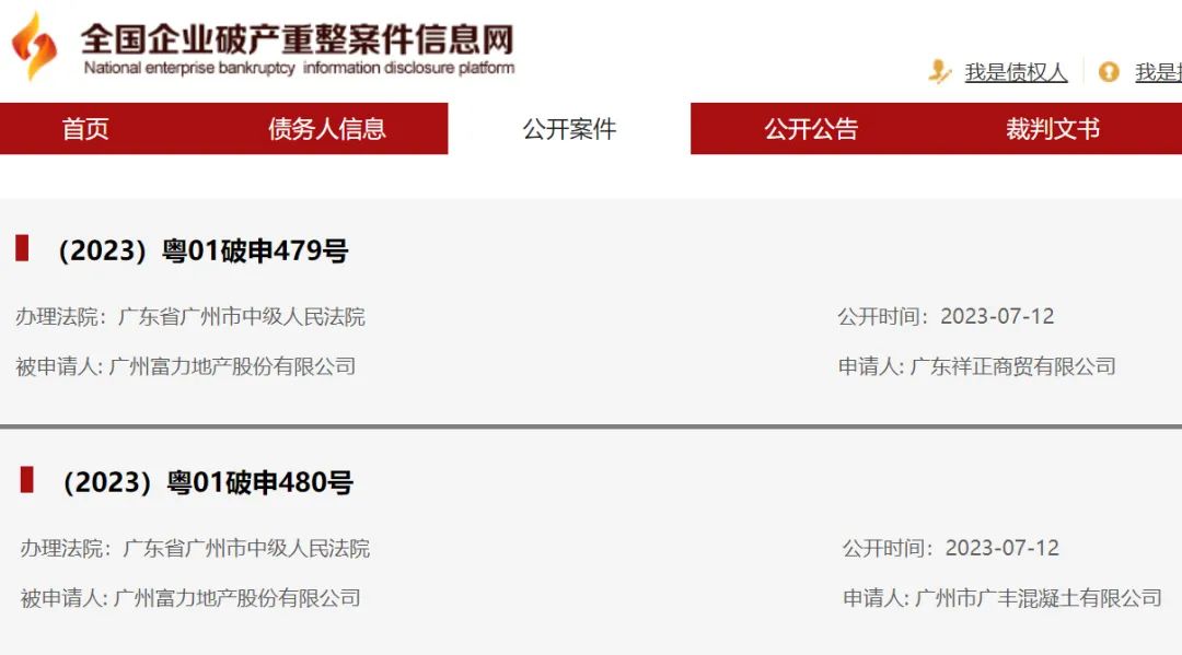 全国企业破产重整案件信息网显示,富力地产被广东祥正商贸有限公司(下称“祥正商贸”)、广州市广丰混凝土有限公司(下称“广丰混凝土”)申请破产重整。经办法院均为广东省广州市中级人民法院,公开时间为2023年7月12日。
