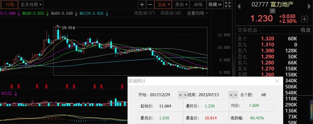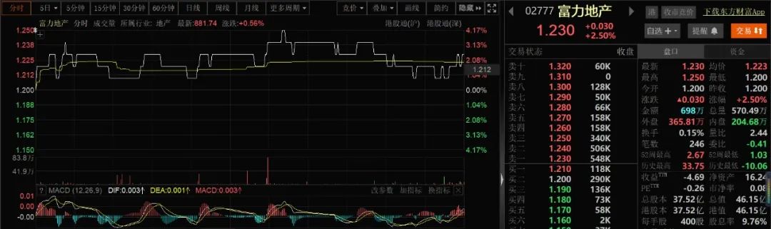 针对上述被申请破产重整消息,富力地产的股价没有太大变动,截至2023年7月13日收盘报收1.23港元/股,市值46.15亿港元。