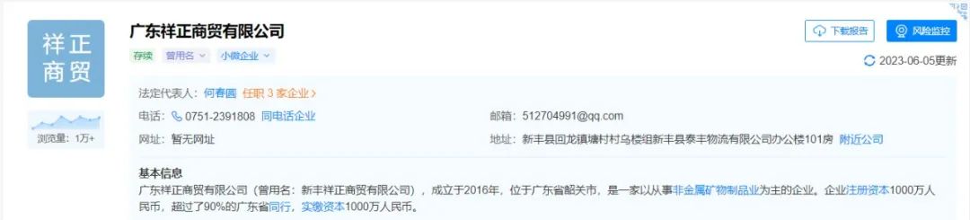 天眼查显示,祥正商贸成立于2016年,位于广东省韶关市,是一家以从事非金属矿物制品业为主的企业,注册资本1000万元。