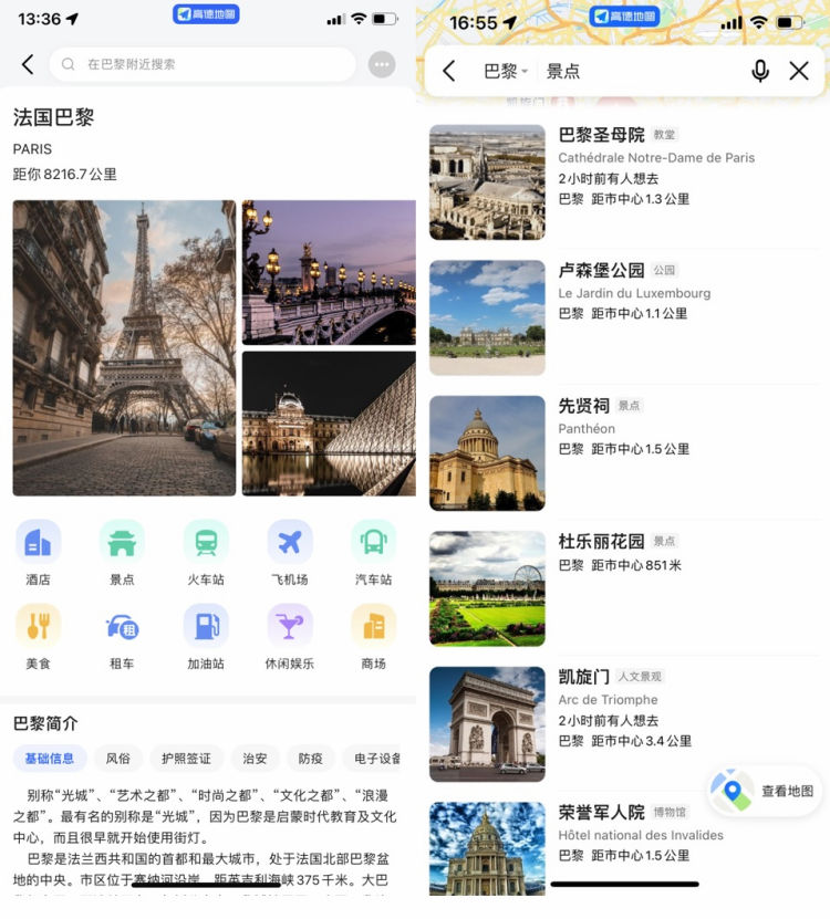 此外,当用户身处某些地区,例如“一带一路”沿线国家和城市时,还可以在高德地图上查看周边的生活服务,包括餐饮、景点、酒店、购物中心等,以更好地了解和体验当地风情。