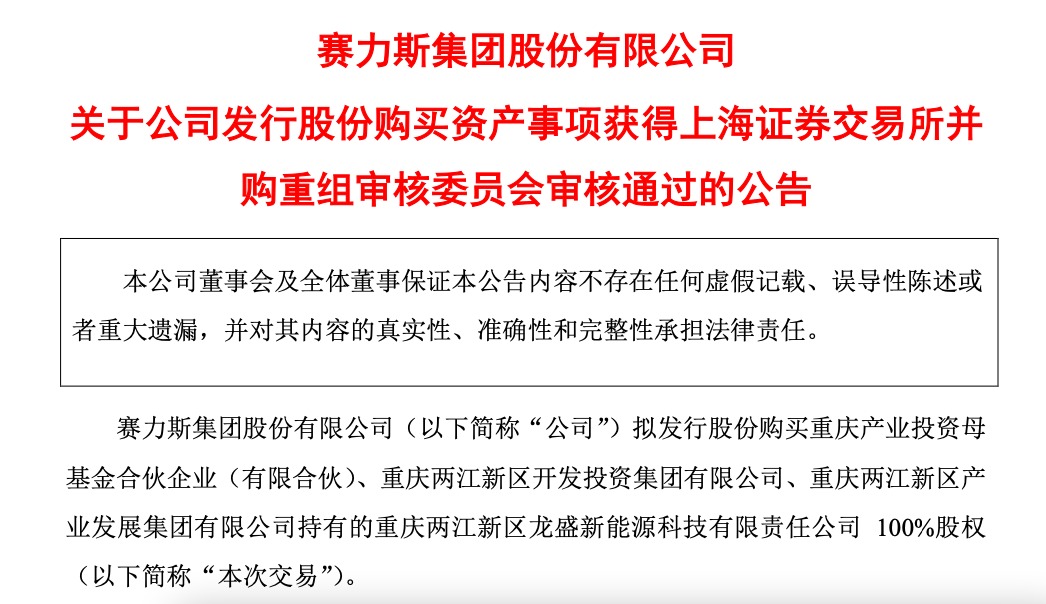 1月21日晚间,赛力斯发布公告宣布,公司拟发行股份购买龙盛新能源100%股权事项,已获得上海证券交易所并购重组审核委员会审核通过。同时,赛力斯方面也提示,该交易需待中国证券监督管理委员会同意注册后方可实施,注册能否获得及时间存在不确定性。