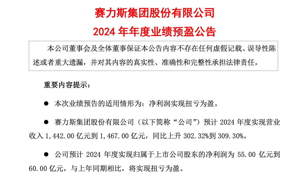 1月21日晚间,赛力斯(601127.SH)发布2024年年报业绩预盈公告称,公司预计2024年度实现营业收入1442亿元到1467亿元,同比增长302.32%到309.30%;预计2024年实现归属上市公司股东的净利润为55亿元至60亿元,与上年同期相比,将实现扭亏为盈。