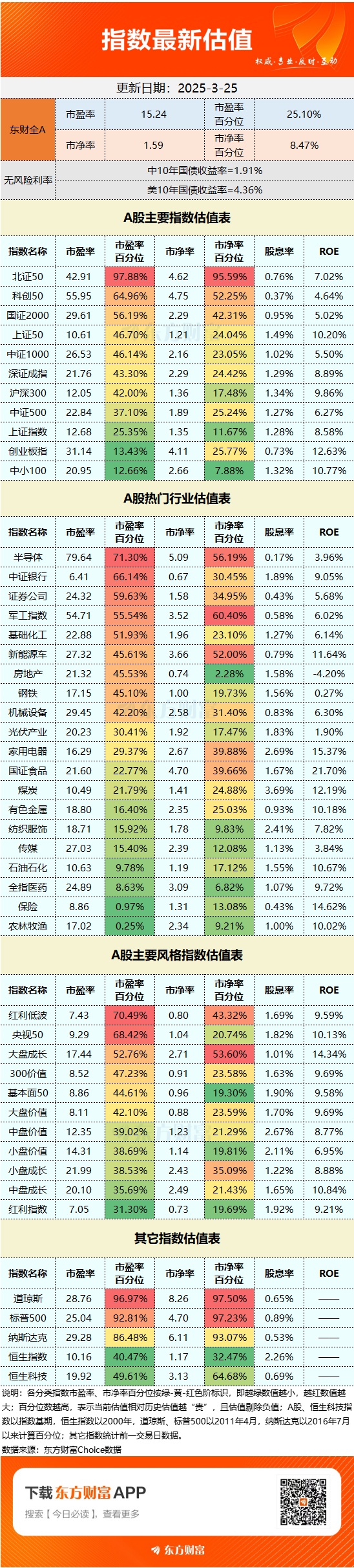 截至3月25日收盘,东方财富Choice数据显示,东财全A市盈率为15.24倍,市盈率百分位为25.1%;市净率为1.59倍,市净率百分位8.47%。