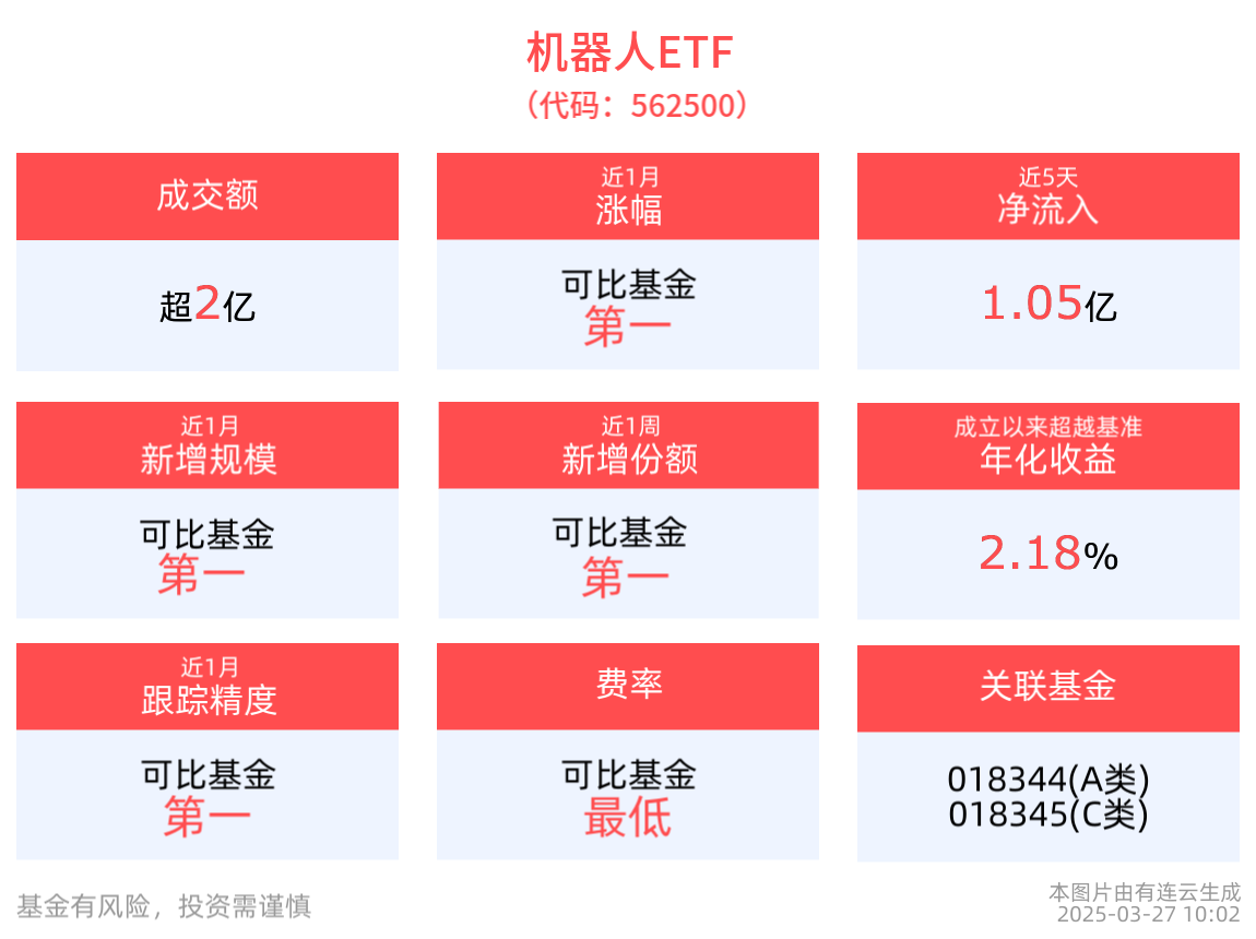 2025年3月27日早盘机器人板块小幅低开后强势拉升,截至10:02,机器人ETF(562500)上涨0.86%,持仓股秦川机床上涨10.01%,雷赛智能上涨10.01%,华辰装备上涨8.56%,信捷电气上涨4.06%,固高科技上涨3.52%。最新盘中成交额已达2.96亿元,暂居可比ETF1/5,换手率2.49%。拉长时间看,截至2025年3月26日,机器人ETF近3月累计上涨13.45%,涨幅排名可比基金1/5。