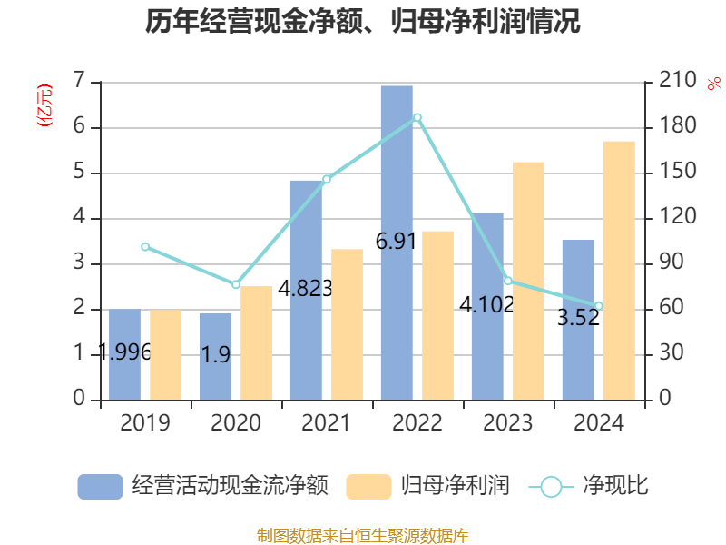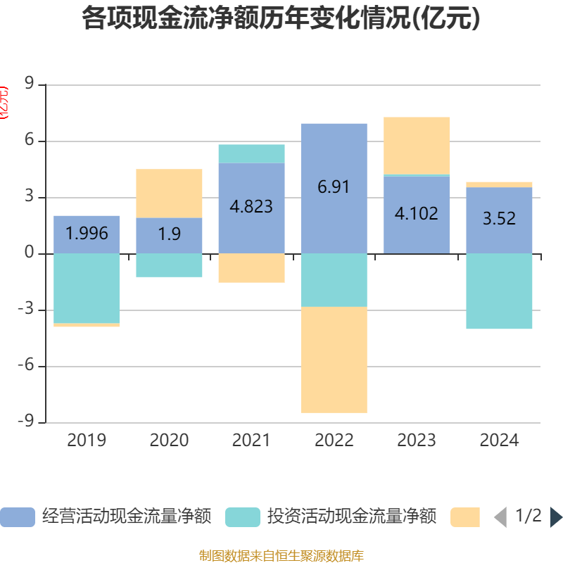 截至2024年,公司经营活动现金流净额为3.52亿元,同比下降14.18%;筹资活动现金流净额2779.83万元,同比减少2.76亿元;投资活动现金流净额-4.02亿元,上年同期为1168.32万元。