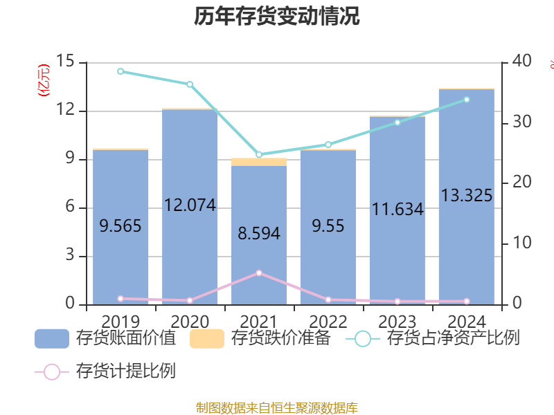 从存货变动来看,截至2024年末,公司存货账面价值为13.32亿元,占净资产的33.84%,较上年末增加1.69亿元。其中,存货跌价准备为678.89万元,计提比例为0.51%。
