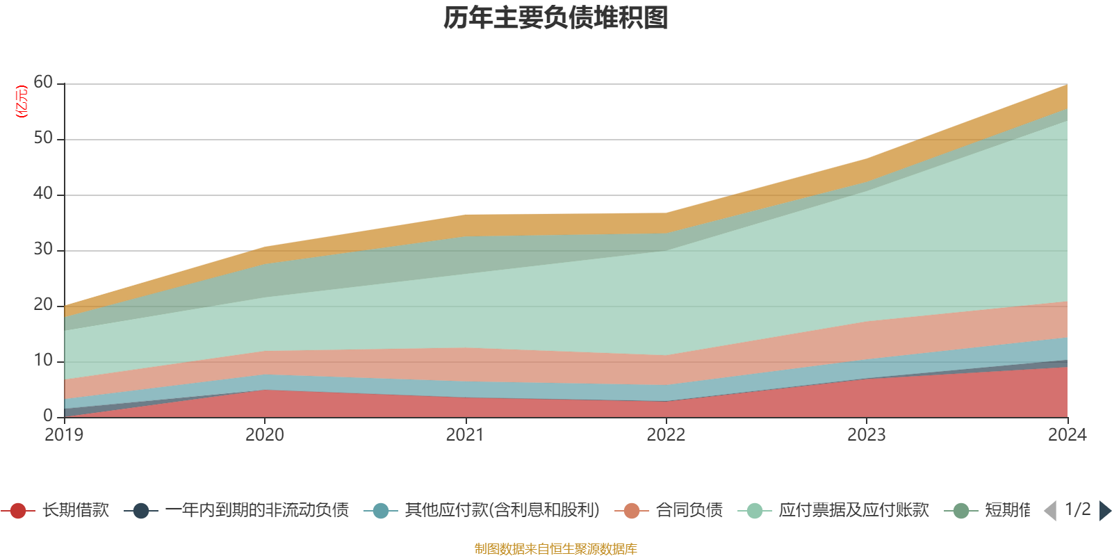 负债重大变化方面,截至2024年末,公司应付票据及应付账款较上年末增加38.49%,占公司总资产比重上升5.14个百分点;合同负债较上年末减少5.08%,占公司总资产比重下降1.38个百分点;一年内到期的非流动负债较上年末增加709.31%,占公司总资产比重上升1.08个百分点;长期借款较上年末增加31.91%,占公司总资产比重上升1.06个百分点。