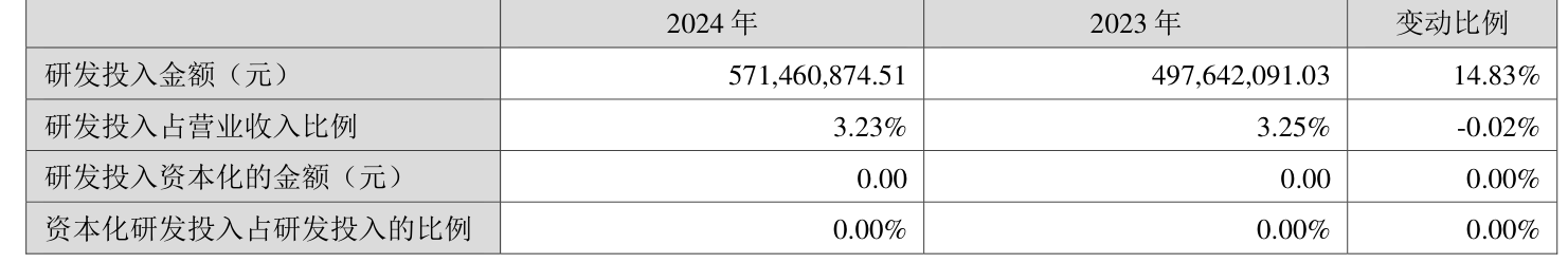 2024年全年,公司研发投入金额为5.71亿元,同比增长14.83%;研发投入占营业收入比例为3.23%,相比上年同期下降0.02个百分点。此外,公司全年研发投入资本化率为0%。
