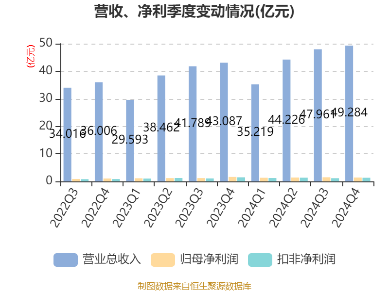 年报显示,2024年末的公司十大流通股东中,新进股东为谭文稠、范志宏,取代了三季度末的海富通改革驱动灵活配置混合型证券投资基金、交银施罗德启诚混合型证券投资基金。在具体持股比例上,香港中央结算有限公司持股有所上升,交银施罗德趋势优先混合型证券投资基金持股有所下降。