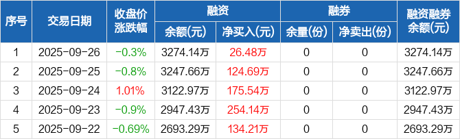 融资方面,当日融资买入312.26万元,融资偿还285.79万元,融资净买入26.48万元,连续7日净买入累计929.53万元。融券方面,融券卖出0份,融券偿还0份,融券余量0份,融券余额0元。融资融券余额合计3274.14万元。