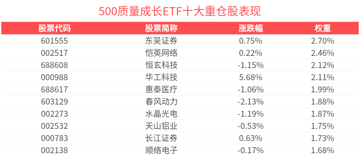 据Wind数据显示,截至2025年8月29日,中证500质量成长指数(930939)前十大权重股分别为东吴证券(601555)、华工科技(000988)、恺英网络(002517)、水晶光电(002273)、恒玄科技(688608)、春风动力(603129)、天山铝业(002532)、长江证券(000783)、顺络电子(002138)、金诚信(603979),前十大权重股合计占比21.48%。