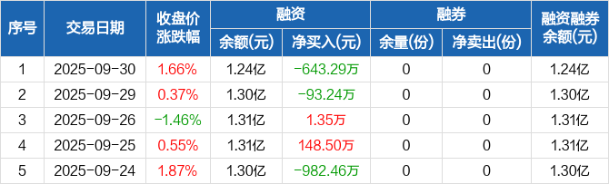融资方面,当日融资买入2166.9万元,融资偿还2810.2万元,融资净偿还643.29万元。融券方面,融券卖出0份,融券偿还0份,融券余量0份,融券余额0元。融资融券余额合计1.24亿元。