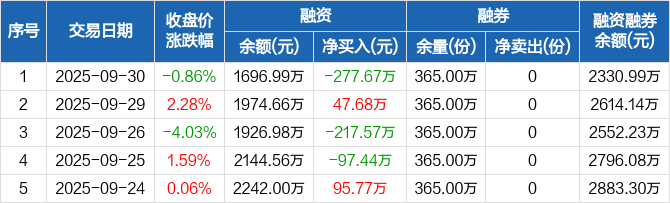融资方面,当日融资买入505.11万元,融资偿还782.79万元,融资净偿还277.67万元。融券方面,融券卖出0份,融券偿还0份,融券余量365万份,融券余额634.01万元。融资融券余额合计2330.99万元。