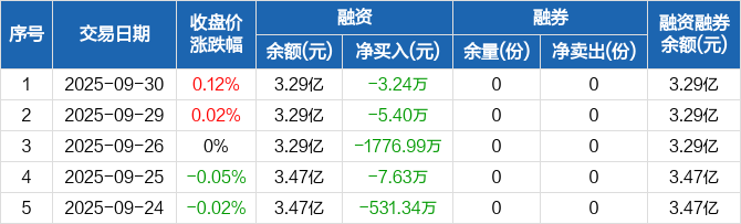 融资方面,当日融资买入2.16万元,融资偿还5.4万元,融资净偿还3.24万元,连续5日净偿还累计2324.61万元。融券方面,融券卖出0份,融券偿还0份,融券余量0份,融券余额0元。融资融券余额合计3.29亿元。
