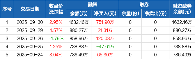 融资方面,当日融资买入957.36万元,融资偿还205.47万元,融资净买入751.9万元,连续3日净买入累计893.29万元。融券方面,融券卖出0份,融券偿还0份,融券余量0份,融券余额0元。融资融券余额合计1632.16万元。