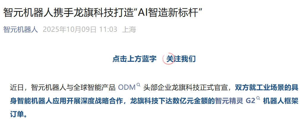 在智元机器人看来,此次合作是其首次与消费电子ODM(原始设计制造商)头部企业龙旗科技达成亿元级合作,标志着其在“工业制造场景规模化商用”取得重要突破。