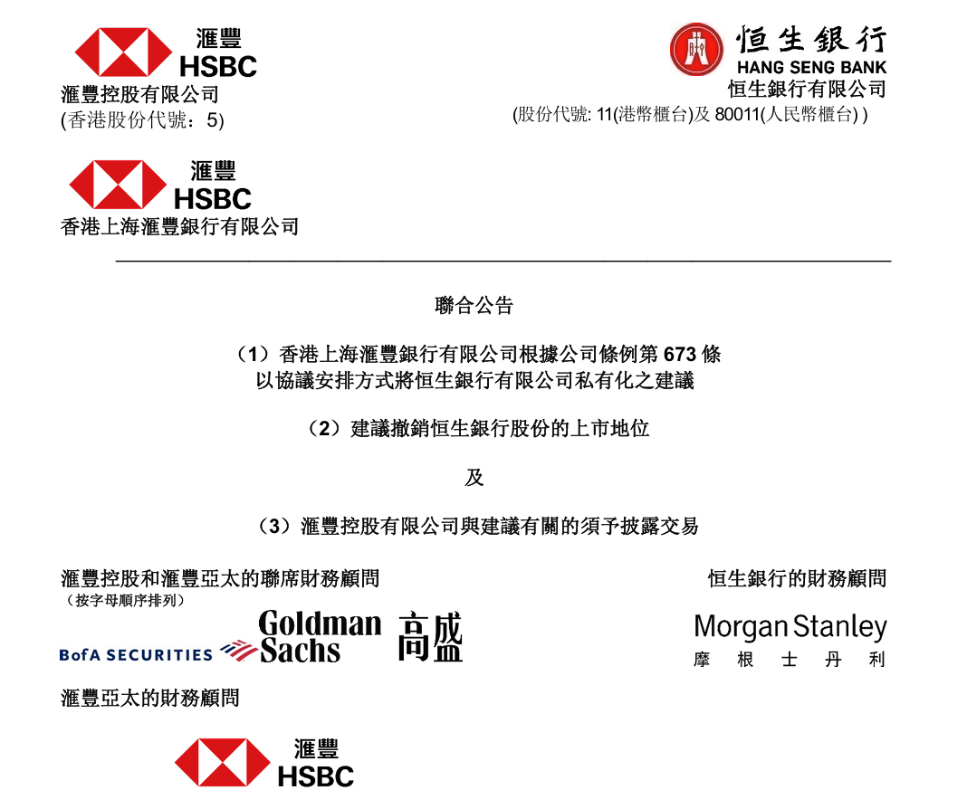10月9日,汇丰控股(00005)、香港上海汇丰银行有限公司(下称“汇丰亚太”)与恒生银行(00011)联合公告,宣布汇丰亚太拟依据香港《公司条例》第673条以协议安排方式私有化恒生银行,并建议撤销其港交所上市地位。