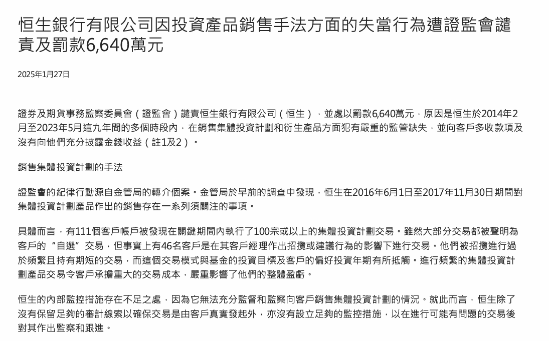 首先是监管层面的重大挫折:1月27日,香港证监会对恒生处以6640万港元罚款,这是该行成立以来首次收到此类高额罚单。据证监会公告披露,2014年2月至2023年5月间,恒生存在三大严重监管缺失:一是46名客户在客户经理主动招揽下进行频繁短线交易,交易模式与基金投资目标及客户风险偏好明显抵触,违背了客户利益优先原则;二是向388名未被认定具备衍生工具知识的客户销售629宗衍生工具基金,其中148宗产品风险显著高于客户承受水平,存在“不当销售”问题;三是多收客户费用且未充分披露收益,累计多收金额超2240万港元,侵犯了客户知情权与财产权。这一罚单不仅让恒生面临直接财务损失,更暴露了其在合规管理、客户适当性管理上的系统性漏洞,对品牌声誉造成严重冲击。