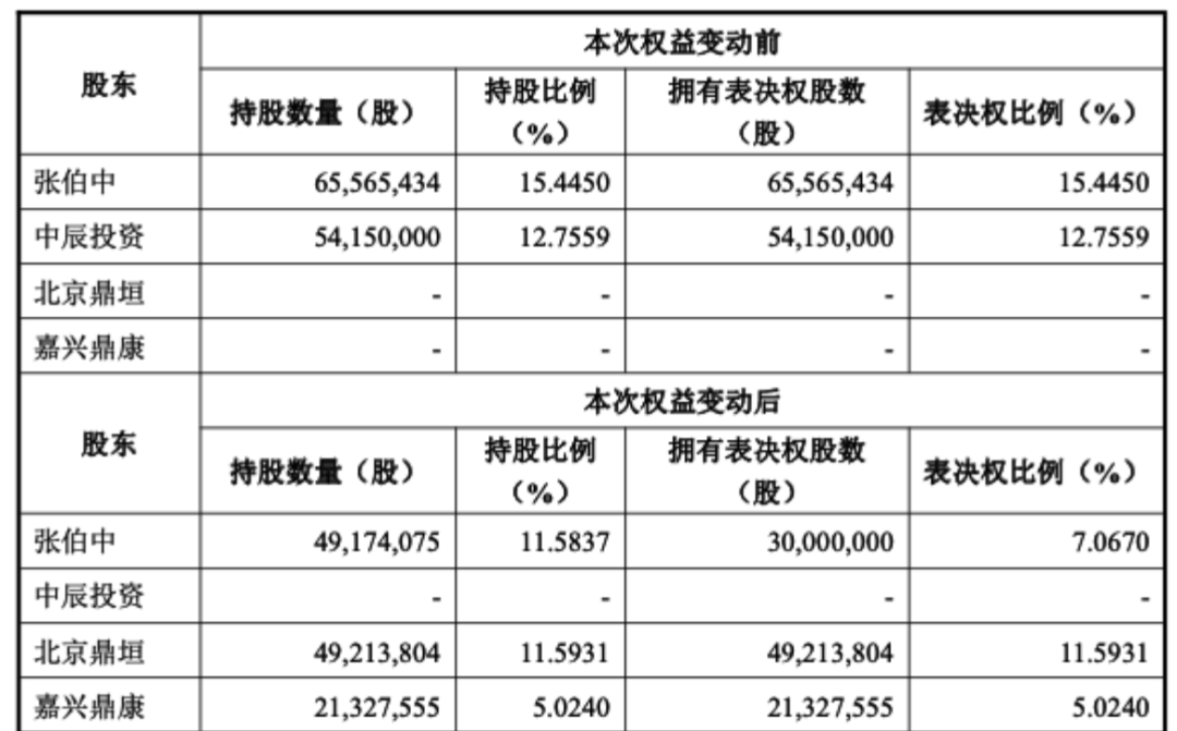 根据协议,张伯中将其持有的1639.14万股公司股票(占公司总股本的3.8612%)转让给嘉兴鼎康,中辰投资将其持有的493.62万股公司股票(占公司总股本的1.1628%)转让给嘉兴鼎康,中辰投资将其持有的4921.38万股公司股票(占公司总股本的11.5931%)转让给北京鼎垣。