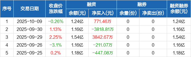 融资方面,当日融资买入2653.83万元,融资偿还1882.37万元,融资净买入771.46万元。融券方面,融券卖出0份,融券偿还0份,融券余量0份,融券余额0元。融资融券余额合计1.24亿元。