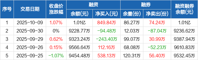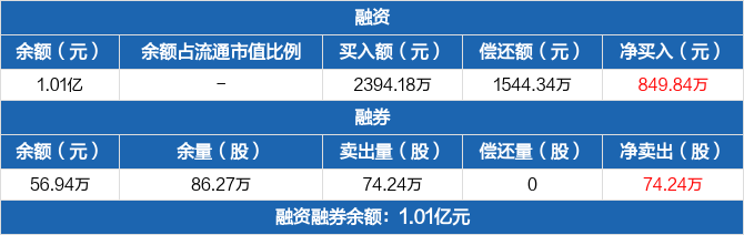 融资方面,当日融资买入2394.18万元,融资偿还1544.34万元,融资净买入849.84万元。融券方面,融券卖出74.24万份,融券偿还0份,融券余量86.27万份,融券余额56.94万元。融资融券余额合计1.01亿元。