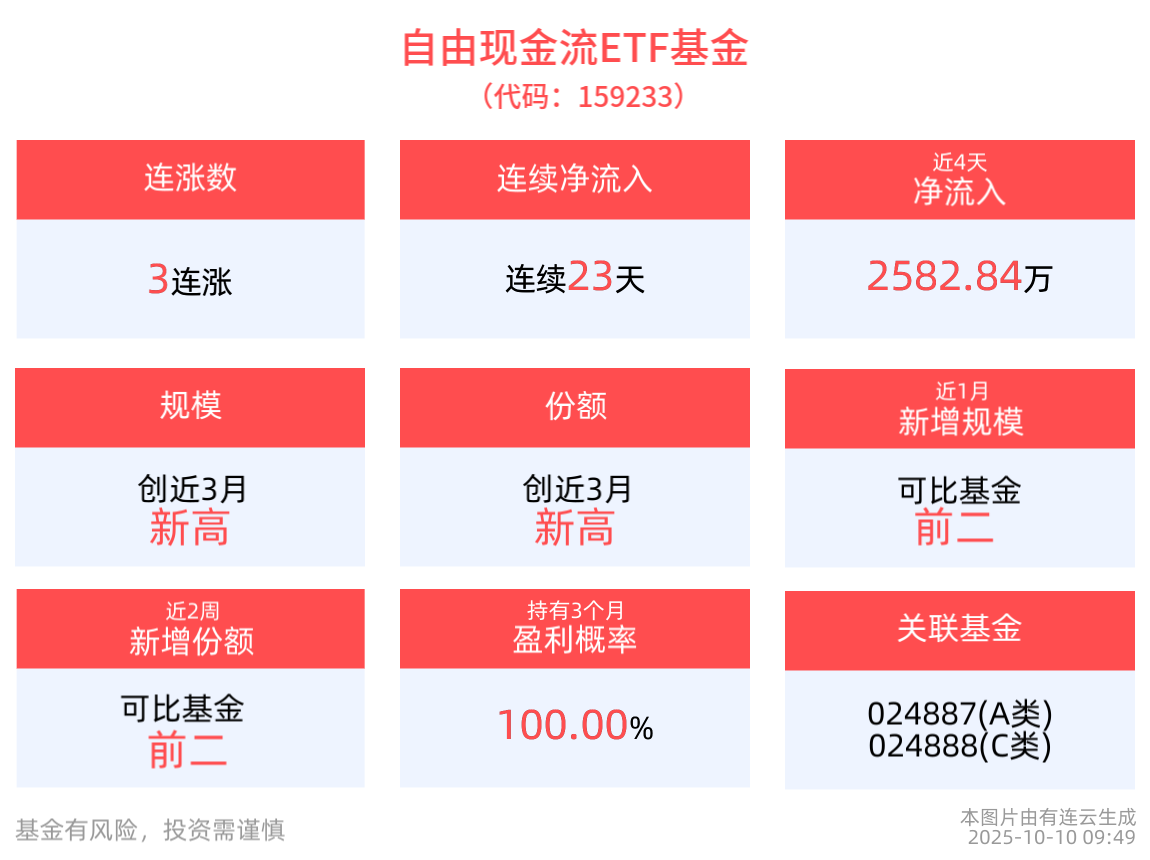从收益能力看,截至2025年10月9日,自由现金流ETF基金自成立以来,最高单月回报为7.80%,最长连涨月数为4个月,最长连涨涨幅为12.71%,涨跌月数比为4/0,上涨月份平均收益率为3.08%,月盈利百分比为100.00%,月盈利概率为89.04%,历史持有3个月盈利概率为100.00%。