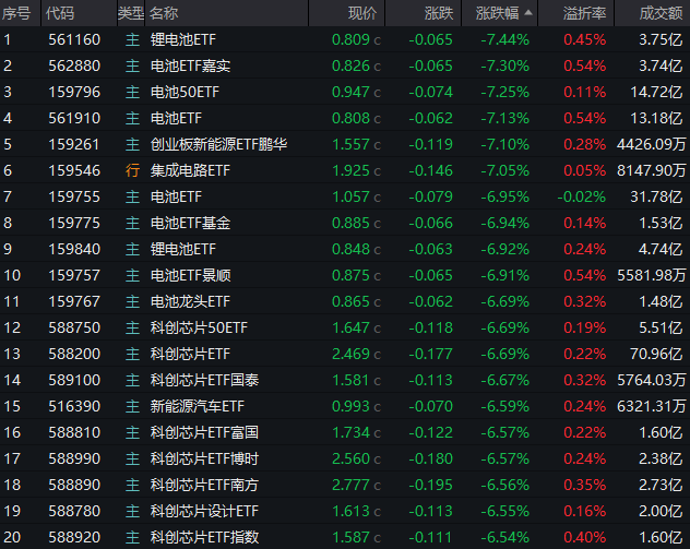 近两月连续上涨的电池主题ETF(交易型开放式指数基金)集体回调,当日最大跌幅超过7%。除电池主题ETF外,集成电路、科创芯片、新能源等主题ETF当日跌幅也居前。
