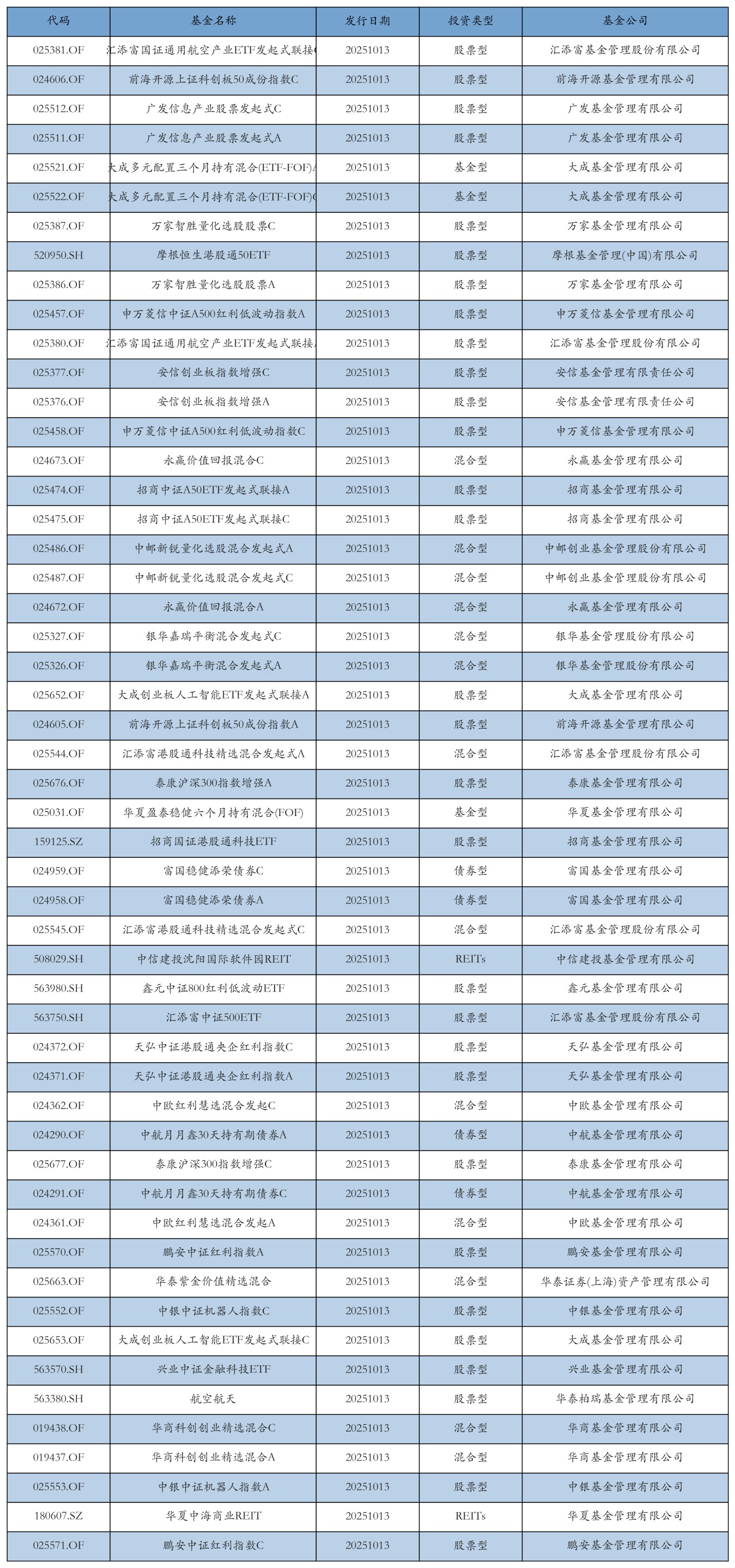 昨日有52只新基金发行,分别为:汇添富国证通用航空产业ETF发起式联接C、前海开源上证科创板50成份指数C、广发信息产业股票发起式C、广发信息产业股票发起式A、大成多元配置三个月持有混合(ETF-FOF)A、大成多元配置三个月持有混合(ETF-FOF)C、万家智胜量化选股股票C、摩根恒生港股通50ETF、万家智胜量化选股股票A、申万菱信中证A500红利低波动指数A、汇添富国证通用航空产业ETF发起式联接A、安信创业板指数增强C、安信创业板指数增强A、申万菱信中证A500红利低波动指数C、永赢价值回报混合C、招商中证A50ETF发起式联接A、招商中证A50ETF发起式联接C、中邮新锐量化选股混合发起式A、中邮新锐量化选股混合发起式C、永赢价值回报混合A、银华嘉瑞平衡混合发起式C、银华嘉瑞平衡混合发起式A、大成创业板人工智能ETF发起式联接A、前海开源上证科创板50成份指数A、汇添富港股通科技精选混合发起式A、泰康沪深300指数增强A、华夏盈泰稳健六个月持有混合(FOF)、招商国证港股通科技ETF、富国稳健添荣债券C、富国稳健添荣债券A、汇添富港股通科技精选混合发起式C、中信建投沈阳国际软件园REIT、鑫元中证800红利低波动ETF、汇添富中证500ETF、天弘中证港股通央企红利指数C、天弘中证港股通央企红利指数A、中欧红利慧选混合发起C、中航月月鑫30天持有期债券A、泰康沪深300指数增强C、中航月月鑫30天持有期债券C、中欧红利慧选混合发起A、鹏安中证红利指数A、华泰紫金价值精选混合、中银中证机器人指数C、大成创业板人工智能ETF发起式联接C、兴业中证金融科技ETF、航空航天、华商科创创业精选混合C、华商科创创业精选混合A、中银中证机器人指数A、华夏中海商业REIT、鹏安中证红利指数C,详情见下表: