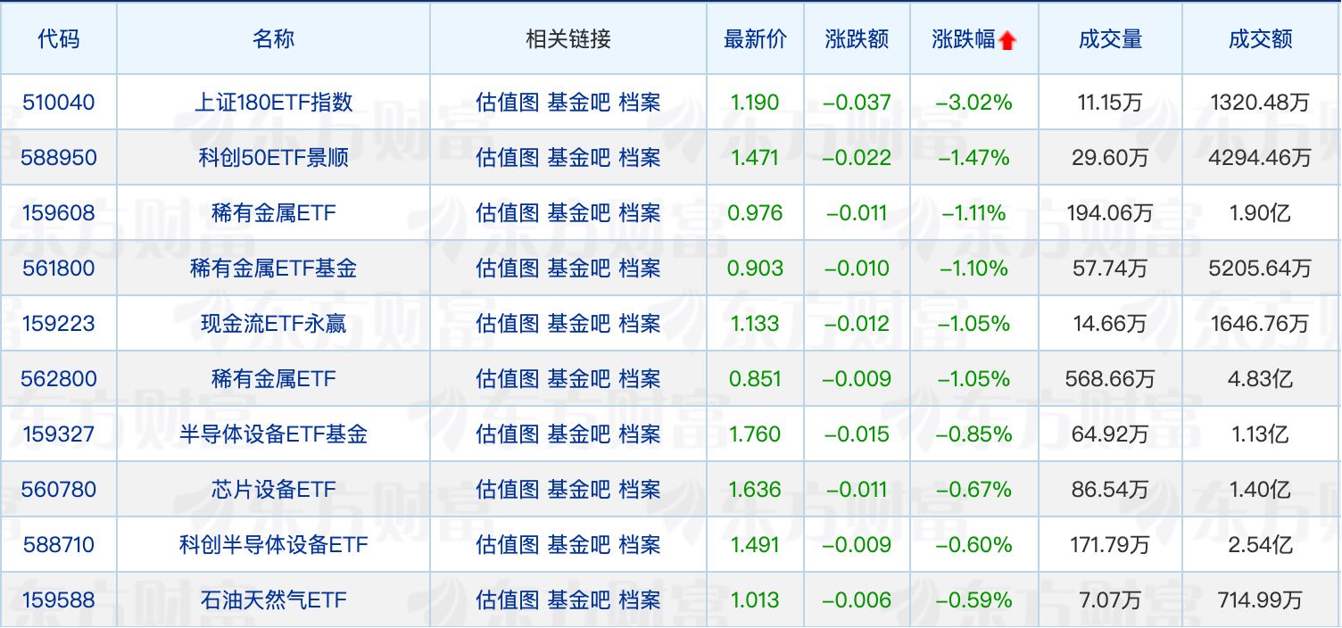 下跌方面,上证180ETF指数领跌3.02%,多只稀有金属ETF回调居前。
