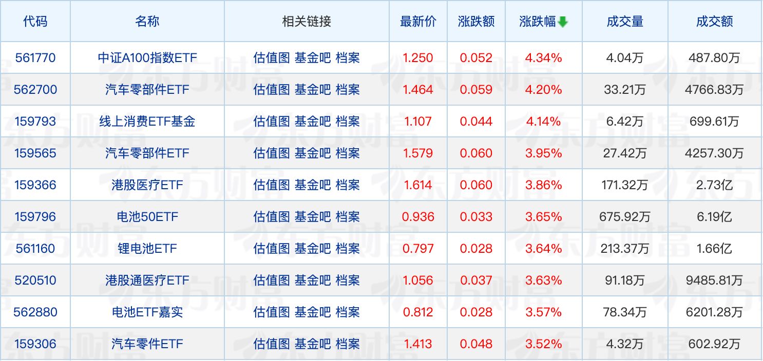 具体来看,中证A100指数ETF、汽车零部件ETF、线上消费ETF基金涨幅均超过4%。