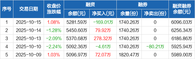 融资方面,当日融资买入499.02万元,融资偿还668.02万元,融资净偿还169.01万元。融券方面,融券卖出0份,融券偿还0份,融券余量1740.26万份,融券余额814.44万元。融资融券余额合计6096.03万元。