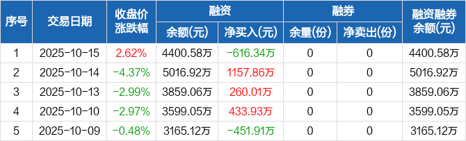 融资方面,当日融资买入1427.16万元,融资偿还2043.5万元,融资净偿还616.34万元。融券方面,融券卖出0份,融券偿还0份,融券余量0份,融券余额0元。融资融券余额合计4400.58万元。
