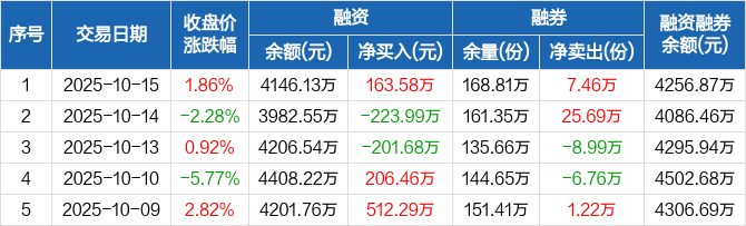 融资方面,当日融资买入632.01万元,融资偿还468.43万元,融资净买入163.58万元。融券方面,融券卖出50.27万份,融券偿还42.81万份,融券余量168.81万份,融券余额110.74万元。融资融券余额合计4256.87万元。