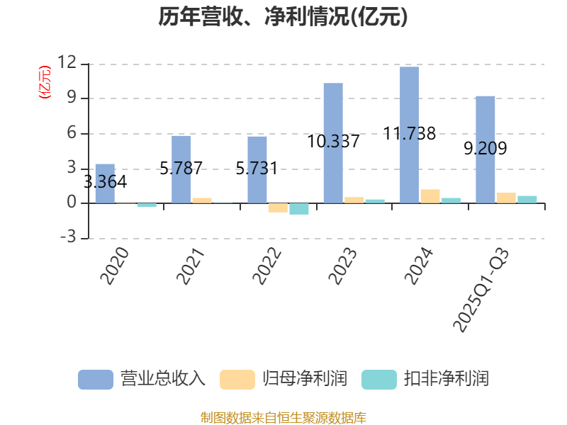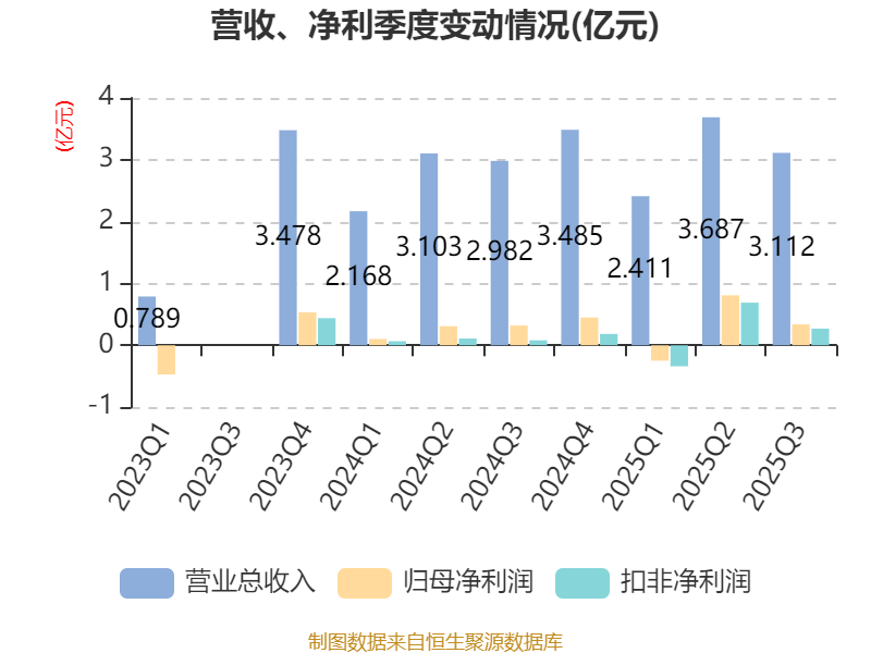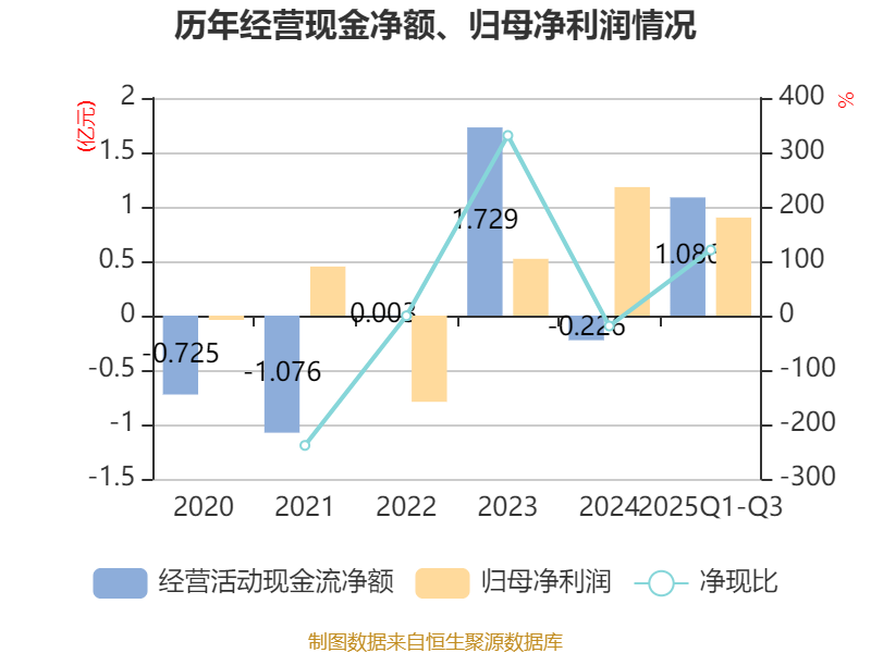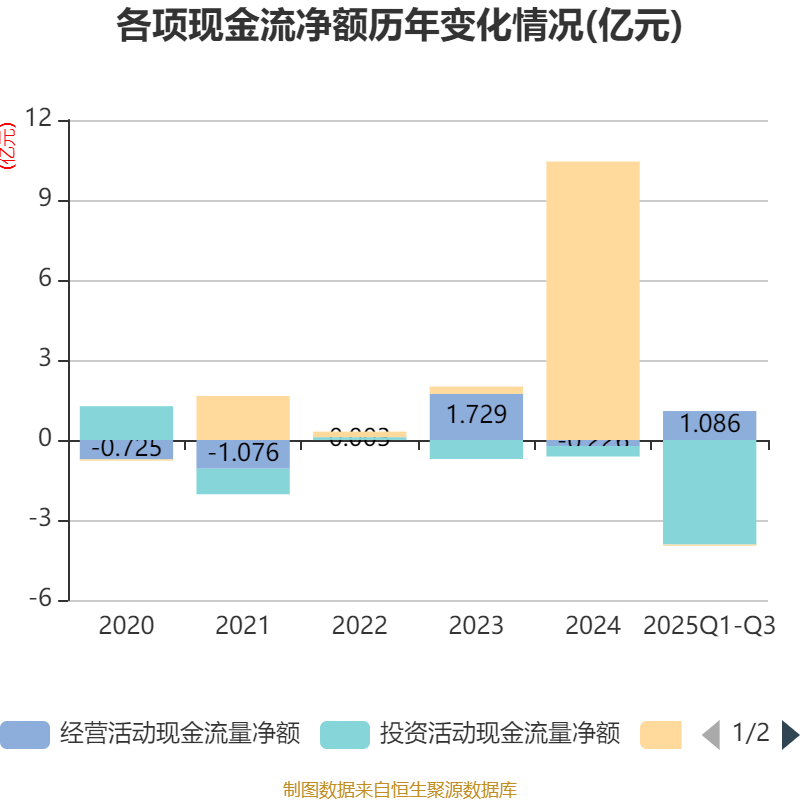 2025年前三季度,公司经营活动现金流净额为1.09亿元,同比增加2.02亿元;筹资活动现金流净额-468.11万元,同比减少4626.58万元;投资活动现金流净额-3.92亿元,上年同期为-1736.91万元。