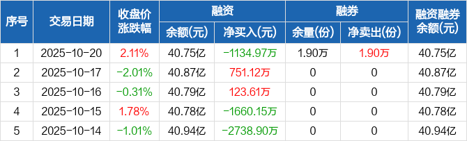 融资方面,当日融资买入2727.7万元,融资偿还3862.67万元,融资净偿还1134.97万元。融券方面,融券卖出1.9万份,融券偿还0份,融券余量1.9万份,融券余额3.03万元。融资融券余额合计40.75亿元。