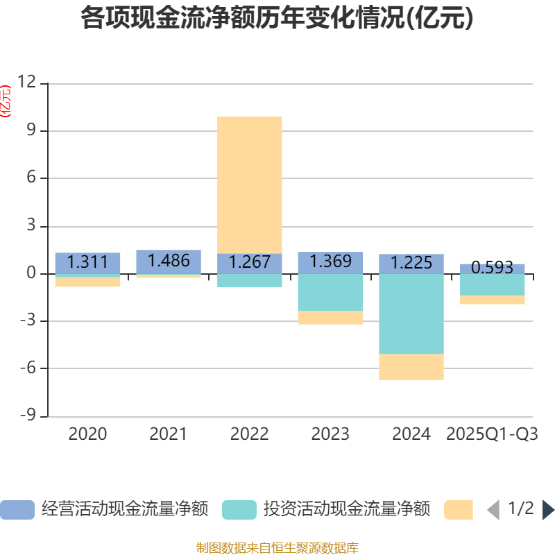 2025年前三季度,公司经营活动现金流净额为5932.77万元,同比增长5.28%;筹资活动现金流净额-5514.87万元,同比增加7044.96万元;投资活动现金流净额-1.38亿元,上年同期为-3.49亿元。