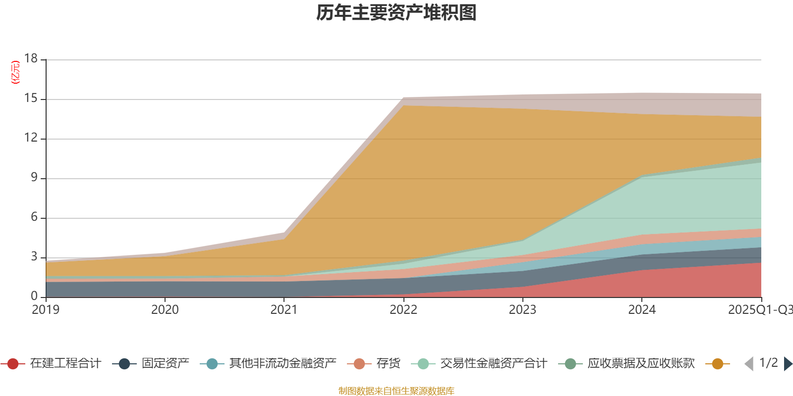 资产重大变化方面,截至2025年三季度末,公司货币资金较上年末减少32.86%,占公司总资产比重下降9.74个百分点;交易性金融资产合计较上年末增加15.47%,占公司总资产比重上升4.44个百分点;在建工程合计较上年末增加27.79%,占公司总资产比重上升3.7个百分点;应收票据及应收账款较上年末增加106.28%,占公司总资产比重上升1.23个百分点。