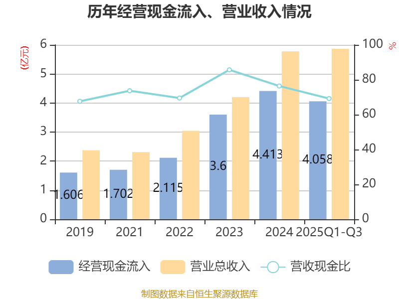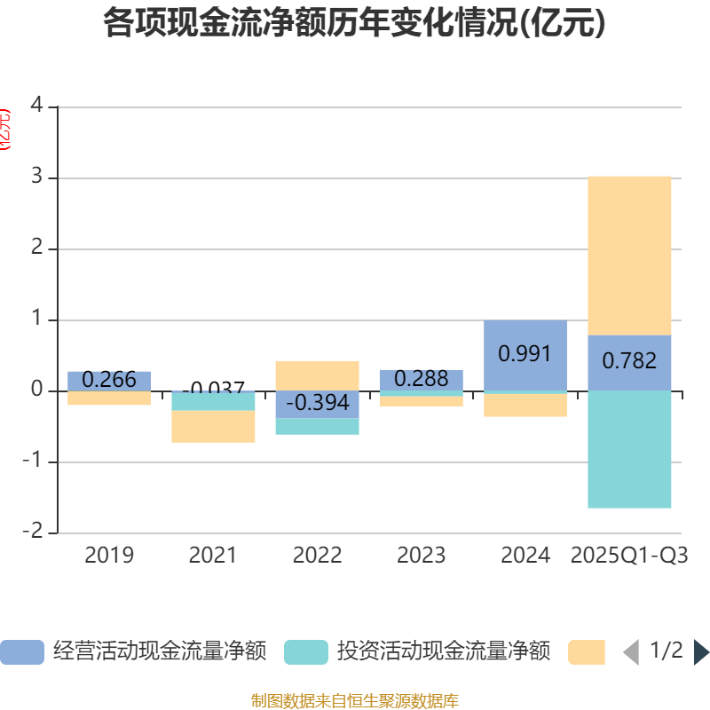 2025年前三季度,公司经营活动现金流净额为7824.49万元,同比增长32.45%;筹资活动现金流净额2.23亿元,同比增加2.55亿元;投资活动现金流净额-1.66亿元,上年同期为-663.23万元。