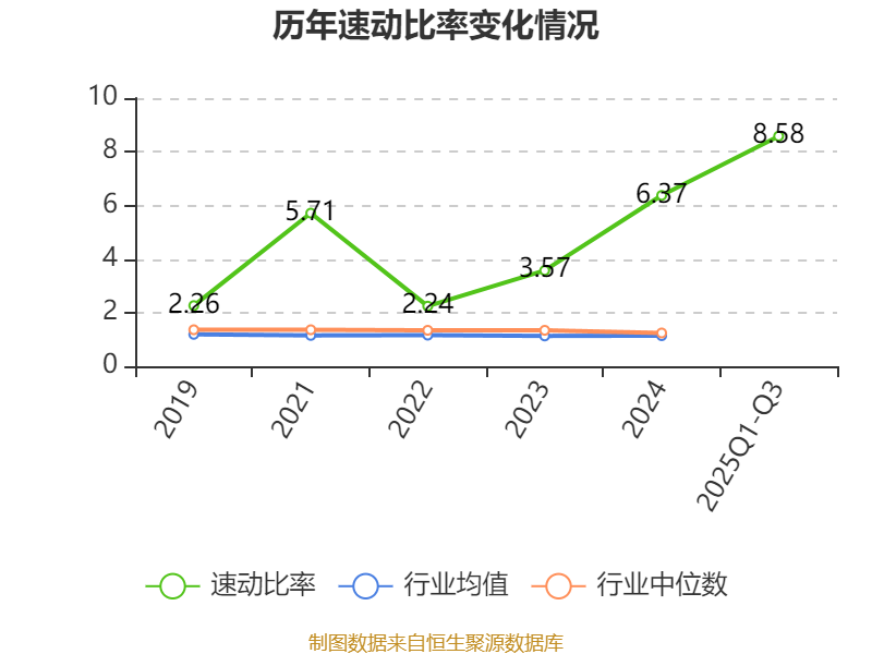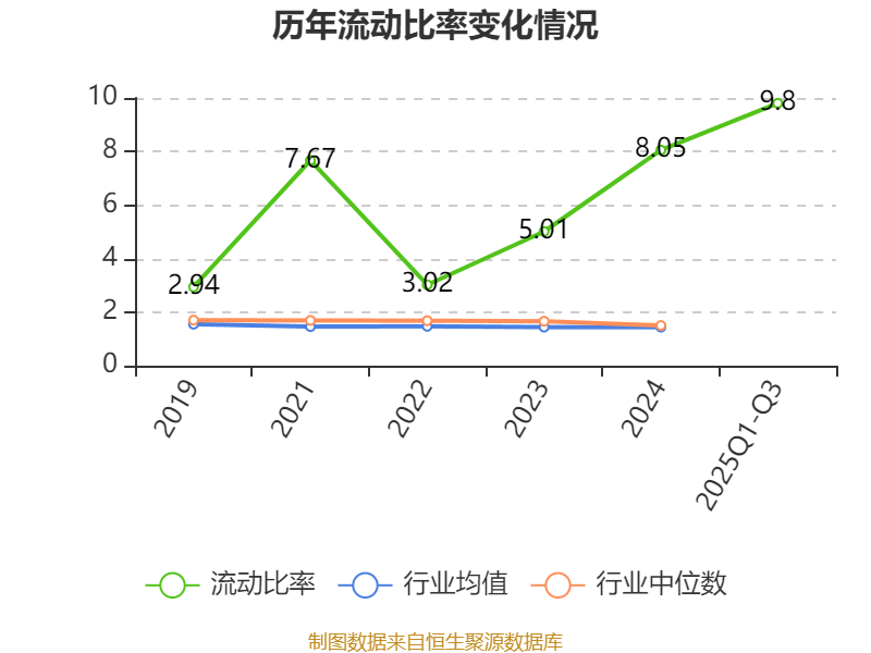 2025年前三季度,公司流动比率为9.8,速动比率为8.58。