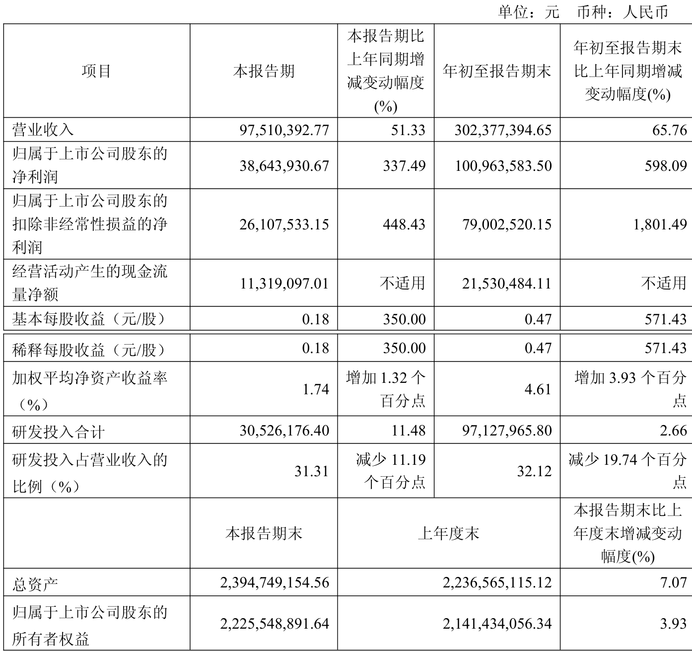 中证智能财讯臻镭科技(688270)10月24日披露2025年第三季度报告。前三季度公司实现营业总收入3.02亿元,同比增长65.76%;归母净利润1.01亿元,同比增长598.09%;扣非净利润7900.25万元,同比增长1801.49%;经营活动产生的现金流量净额为2153.05万元,上年同期为-615.05万元;报告期内,臻镭科技基本每股收益为0.47元,加权平均净资产收益率为4.61%。