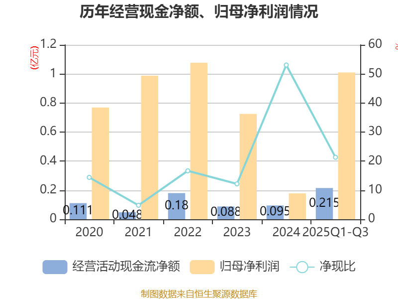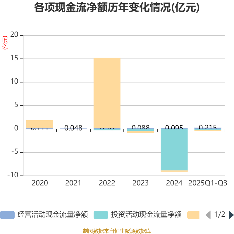 2025年前三季度,公司经营活动现金流净额为2153.05万元,同比增加2768.09万元;筹资活动现金流净额-2057.03万元,同比增加600.49万元;投资活动现金流净额-2987.51万元,上年同期为-3.74亿元。