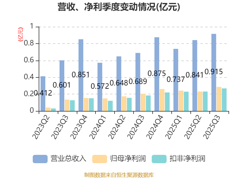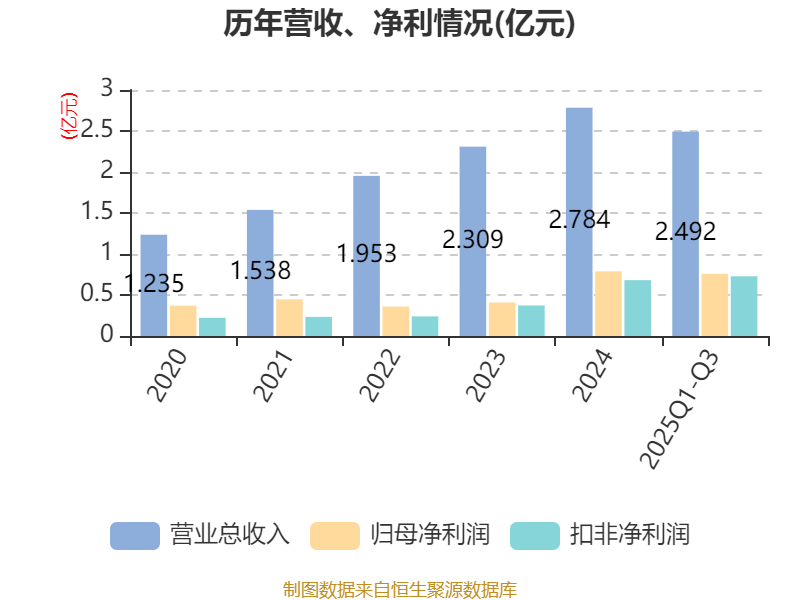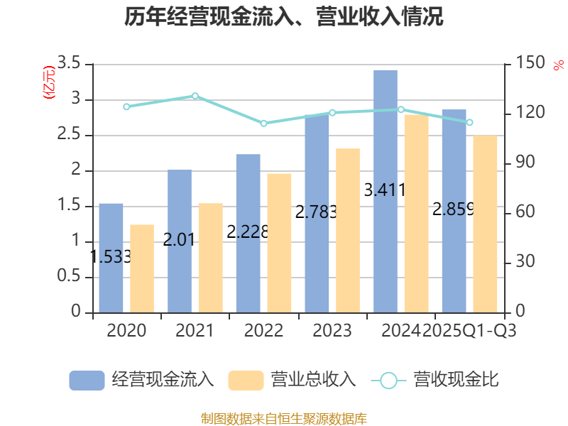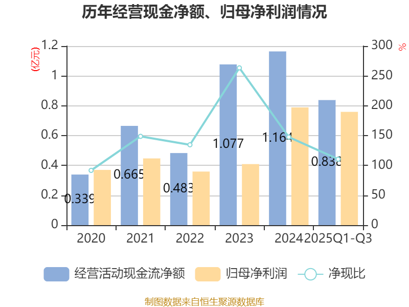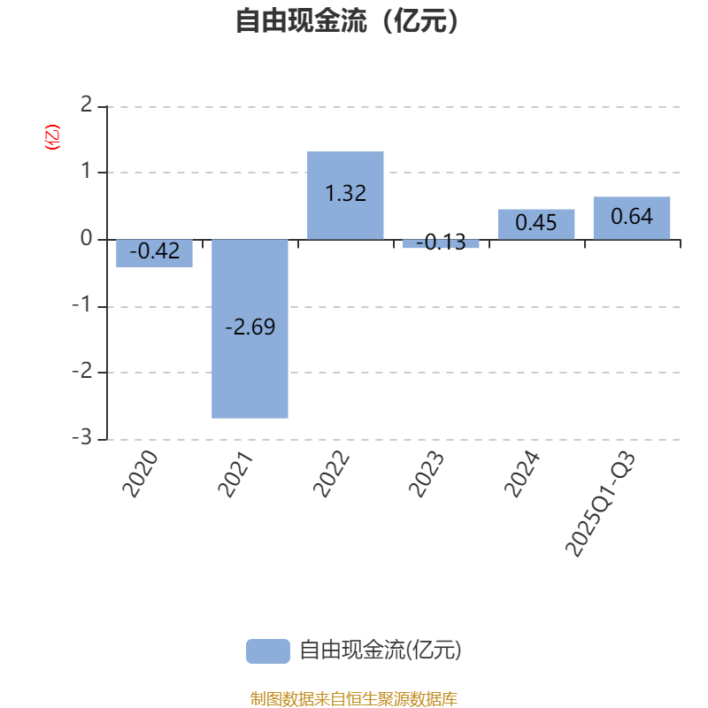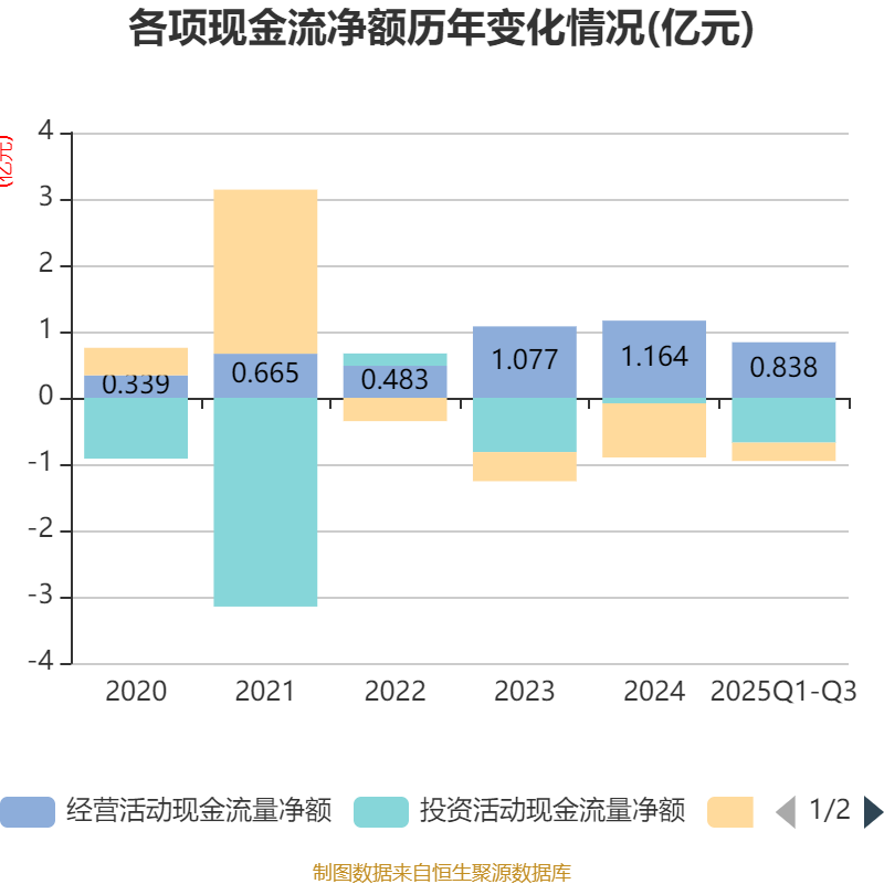 2025年前三季度,公司经营活动现金流净额为8375.82万元,同比增长32.16%;筹资活动现金流净额-2769.82万元,同比增加5258.7万元;投资活动现金流净额-6764.74万元,上年同期为3192.14万元。