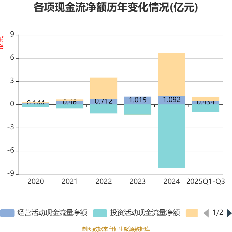 2025年前三季度,公司经营活动现金流净额为4341.39万元,同比下降38.94%;筹资活动现金流净额5469.93万元,同比减少5.05亿元;投资活动现金流净额-9650.51万元,上年同期为-5.91亿元。