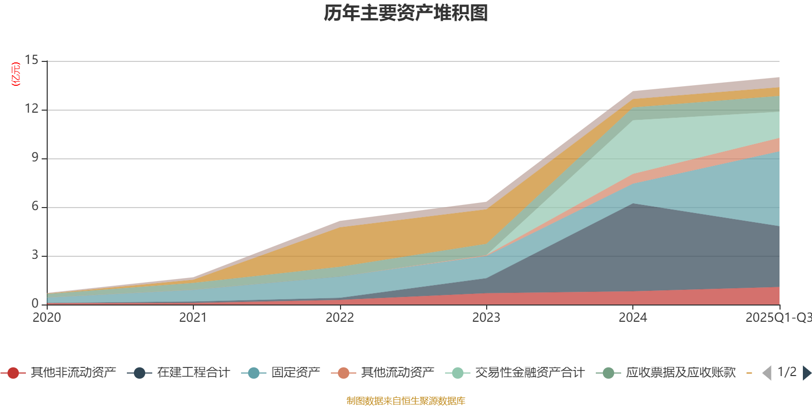 资产重大变化方面,截至2025年三季度末,公司固定资产较上年末增加279.72%,占公司总资产比重上升23.68个百分点;在建工程合计较上年末减少30.81%,占公司总资产比重下降14.46个百分点;交易性金融资产合计较上年末减少51.18%,占公司总资产比重下降13.63个百分点;其他非流动资产较上年末增加32.18%,占公司总资产比重上升1.49个百分点。