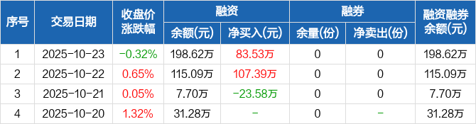 融资方面,当日融资买入106.51万元,融资偿还22.98万元,融资净买入83.53万元。融券方面,融券卖出0份,融券偿还0份,融券余量0份,融券余额0元。融资融券余额合计198.62万元。