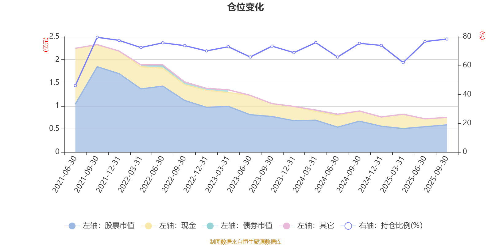 据定期报告数据统计,近三年平均股票仓位为71.67%,同类平均为67.21%。2021年三季度末基金达到79.65%的最高仓位,2021年上半年末最低,为46.11%。